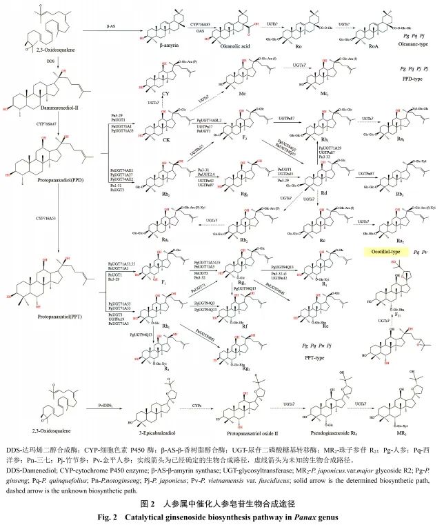三萜皂苷是人参属植物中分布的主要药理活性物质[91],具有抗氧化、抗炎、血管舒张、抗过敏、抗糖尿病等多种作用[92]。根据苷元的骨架结构,人参皂苷主要分为原人参二醇型(protopanaxadiol type,PPD)、原人参三醇型(protopanaxatriol type,PPT)齐墩果酸型(oleanolic acid type,OA)和奥克梯隆醇型(ocotillol type,OCT)。人参皂苷的骨架主要由异戊二烯途径合成,在植物中有2条异戊二烯途径,一条是存在于胞质中的甲羟戊酸(mevalonic acid,MVA)途径,另一条是存在于质体中的磷酸甲基赤藓糖醇(2-C-methyl-D-erythritol 4-phosphate,MEP)途径[93-94]。研究表明三萜皂苷在2,3-氧化鲨烯环化酶(2,3-oxidosqualene cyclases,OSCs)作用下形成三萜类骨架,再经细胞色素P450单加氧酶、糖基转移酶等化学修饰,最终形成不同的三萜皂苷终产物[95]。特别是,三七特有成分三七皂苷R1,具有显著的抗炎、抗氧化和抗肿瘤作用;西洋参中拟人参皂苷F11[96],屏边三七中的屏边三七皂苷E、R1、R2同样具有独特性[97];金平人参OT型皂苷珠子参苷R2的含量较高,且金平人参皂苷R4(vinaginsenoside R4)仅在该物种中被分离获得。因此,人参属植物中皂苷成分组成和差异是后续资源开发和利用的重点工作。