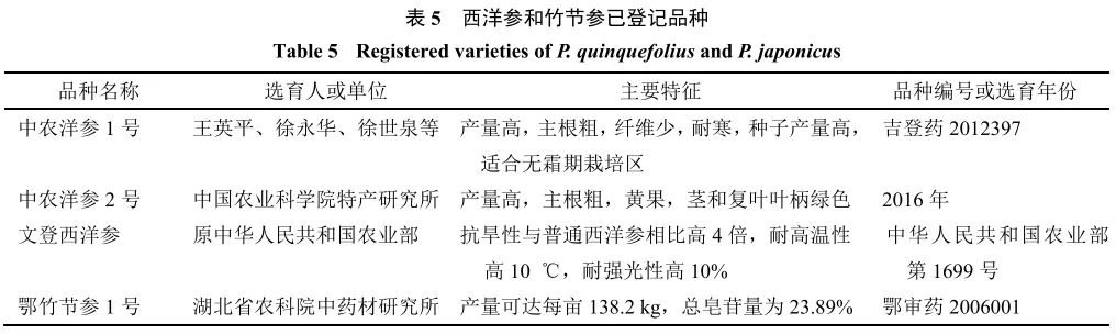 1981年,中国引进美国威斯康辛州西洋参种子,并在山东省威海市文登区引种试栽并成功推广[76]。但由于缺乏完善的西洋参良种繁育技术,出现种质退化,病虫害抗性降低,原有优良性状丧失,严重影响西洋参的产量。2011年,由中国农业科学院特产研究所、抚松县参王植保有限责任公司和吉林中森药业有限公司经多年努力,选育出西洋参新品种“中农洋参1号”[77],是首个人工选育并通过登记的西洋参品种。2016年,中国农业科学院特产研究、参王植保有限公司选育的“中农洋参2号”通过登记[78](表5)。