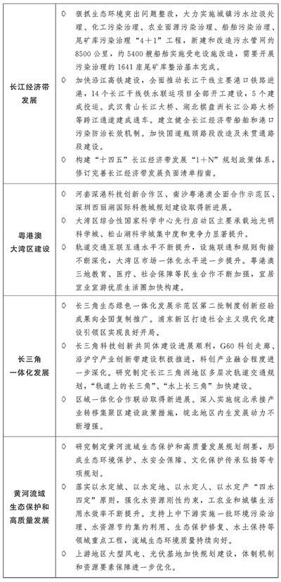 一是区域重大战略深入实施。北京非首都功能疏解取得新突破,国务院印发《关于支持北京城市副中心高质量发展的意见》,雄安新区进入大规模建设阶段,落实支持天津滨海新区高质量发展的意见,张家口首都水源涵养功能区和生态环境支撑区加快建设。长江经济带生态优先、绿色发展深入推进,生态环境突出问题整改和污染治理“4+1”工程稳步推进实施,生态环境系统保护修复成效明显,长江十年禁渔实现良好开局,水生生物资源逐步恢复,沿江综合交通运输体系加快构建,长江保护法正式实施。粤港澳大湾区建设稳步推进,中共中央、国务院印发《横琴粤澳深度合作区建设总体方案》、《全面深化前海深港现代服务业合作区改革开放方案》,基础设施和公共服务融合有序开展。长三角一体化发展深入推进,基础设施互联互通水平持续提升,一体化发展体制机制不断优化,中共中央、国务院印发《关于支持浦东新区高水平改革开放 打造社会主义现代化建设引领区的意见》,构建长三角世界级港口群形成一体化治理体系、共建虹桥国际开放枢纽等重大任务有力推进,生态绿色一体化发展示范区建设取得显著成效。“十四五”黄河流域生态保护和高质量发展实施方案印发,农业、工业、城镇生活和尾矿库污染“3+1”综合治理方案扎实推进,污染防治、生态保护修复、深度节水控水、水土保持等领域重大工程项目稳步实施,在黄河省区完成1.2万平方公里水土流失治理任务。
